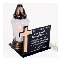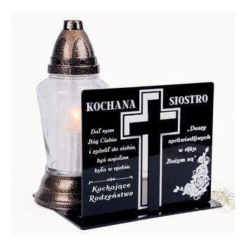 Podstawka pod znicz w kształcie serca w wyciętym krzyżem. Wykonana z czarnej matowej lub błyszczącej pleksi