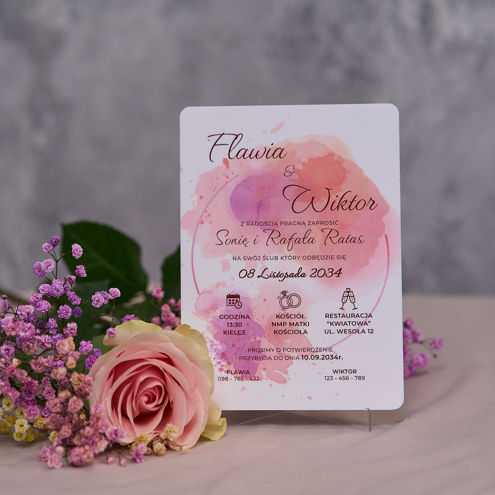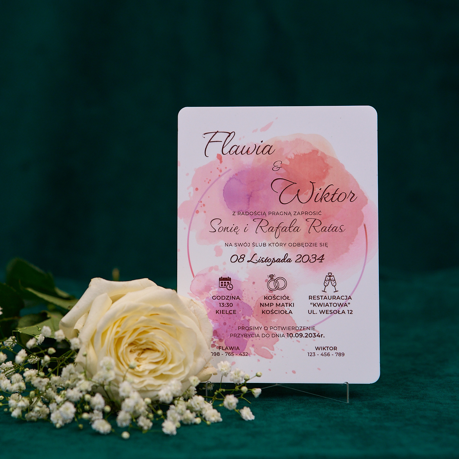 Plexi to wytrzymały i efektowny materiał. Białe wykończenie zaproszeń nadaje im nietuzinowy wygląd oraz nowoczesny styl.