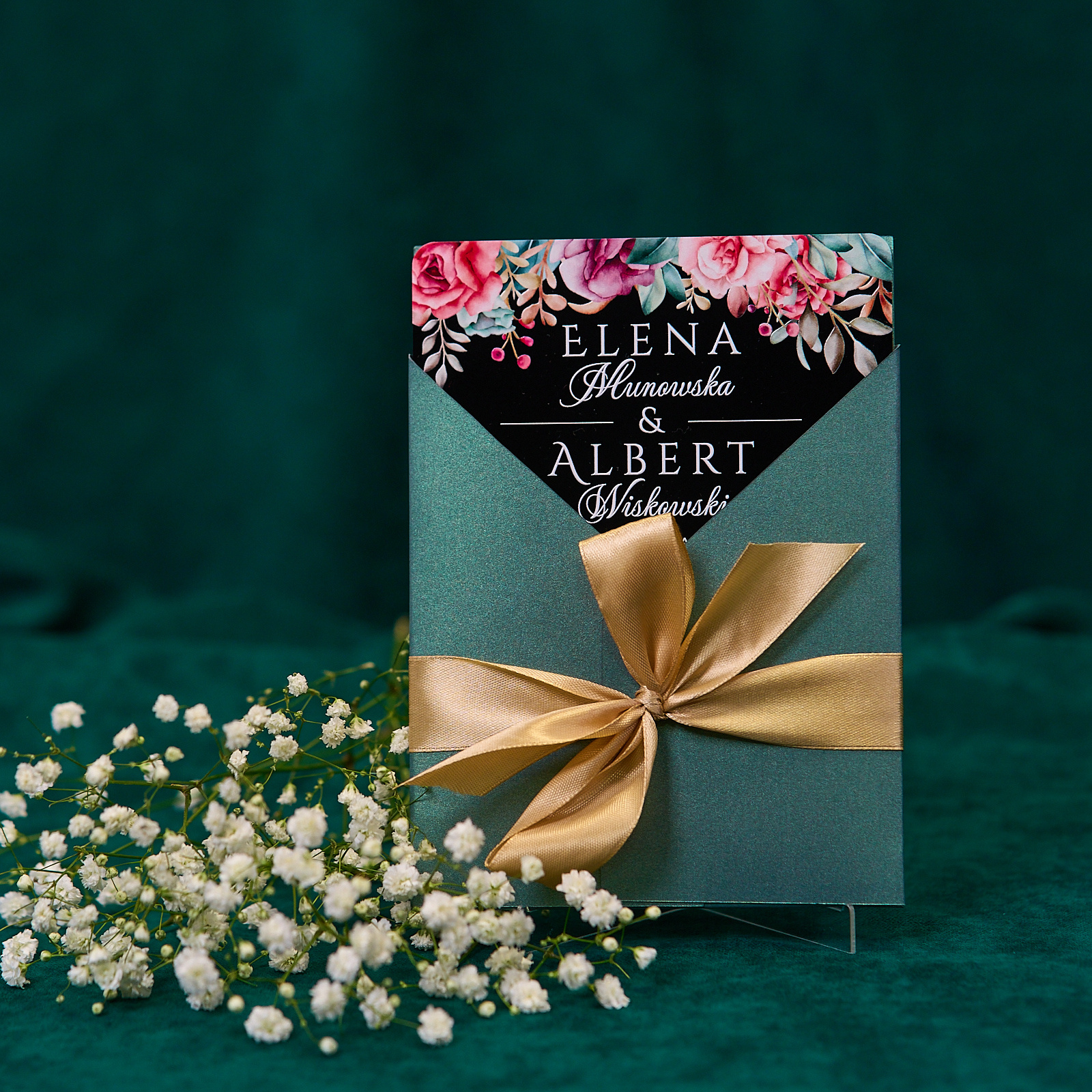 Zaproszenia ślubne PREMIUM wykonane na czarnym błyszczącym SZKLE AKRYLOWYM to nowoczesna i elegancka forma, która zaskoczy Twoich gości.