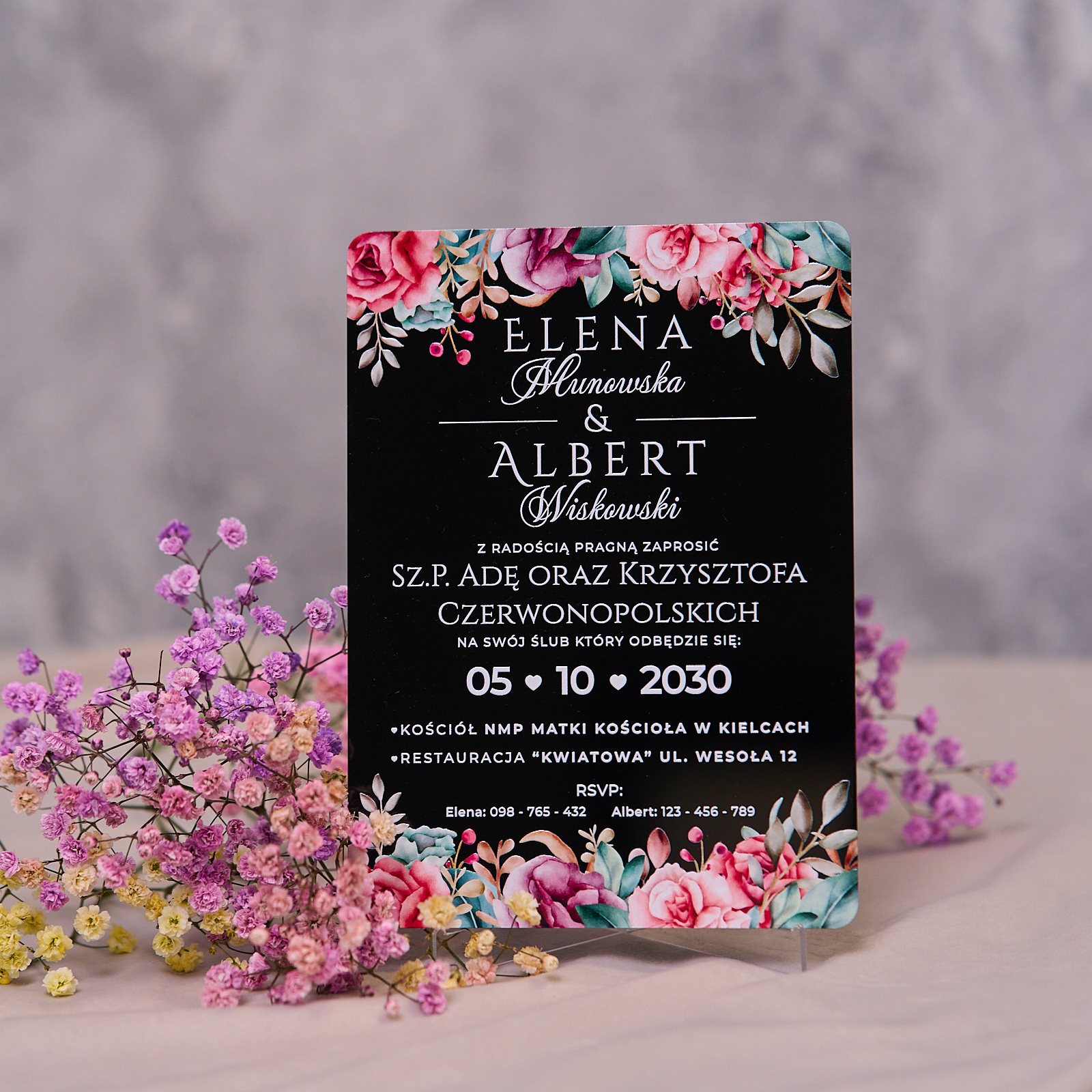 Zaproszenia ślubne PREMIUM wykonane na czarnym błyszczącym SZKLE AKRYLOWYM to nowoczesna i elegancka forma, która zaskoczy Twoich gości.
