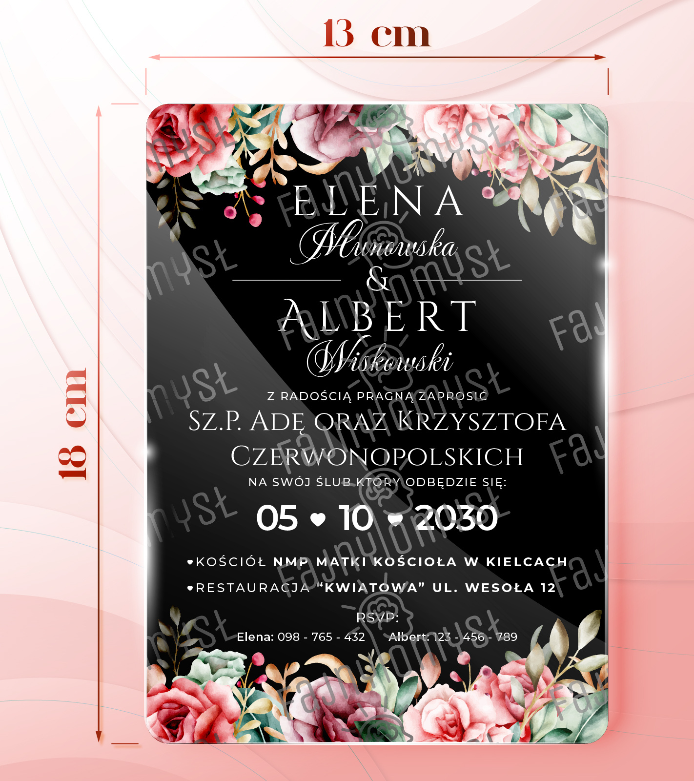 Zaproszenia ślubne PREMIUM wykonane na czarnym błyszczącym SZKLE AKRYLOWYM -ZCZ17A