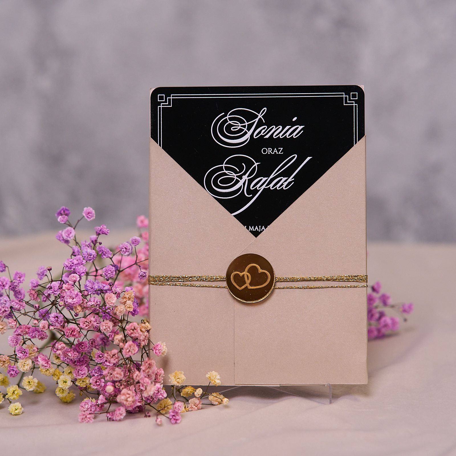 Plexi to wytrzymały i efektowny materiał. Czarne matowe wykończenie zaproszeń nadaje im nietuzinowy wygląd oraz nowoczesny styl.