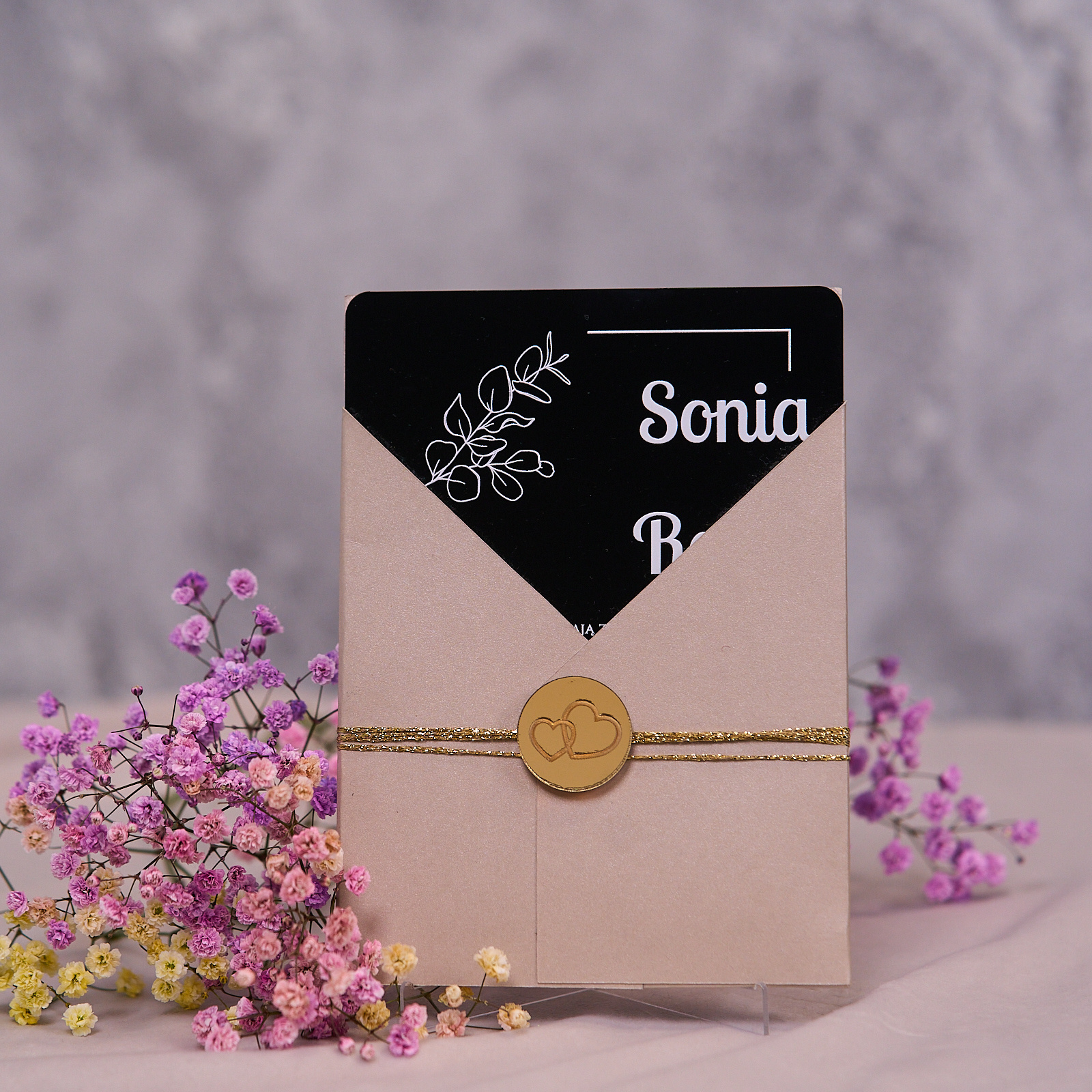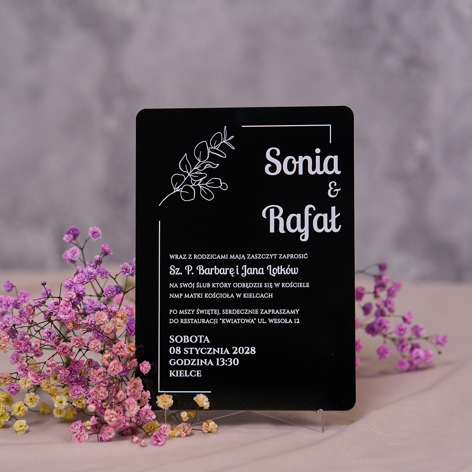 Plexi to wytrzymały i efektowny materiał. Czarne matowe wykończenie zaproszeń nadaje im nietuzinowy wygląd oraz nowoczesny styl.