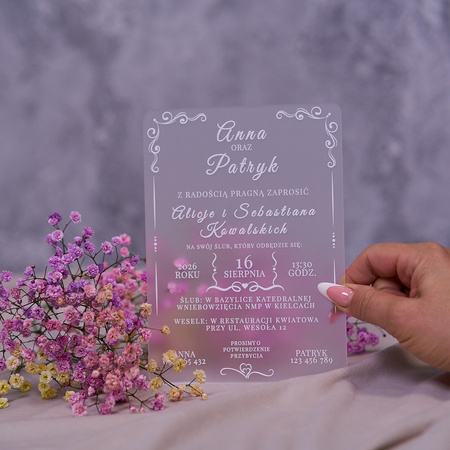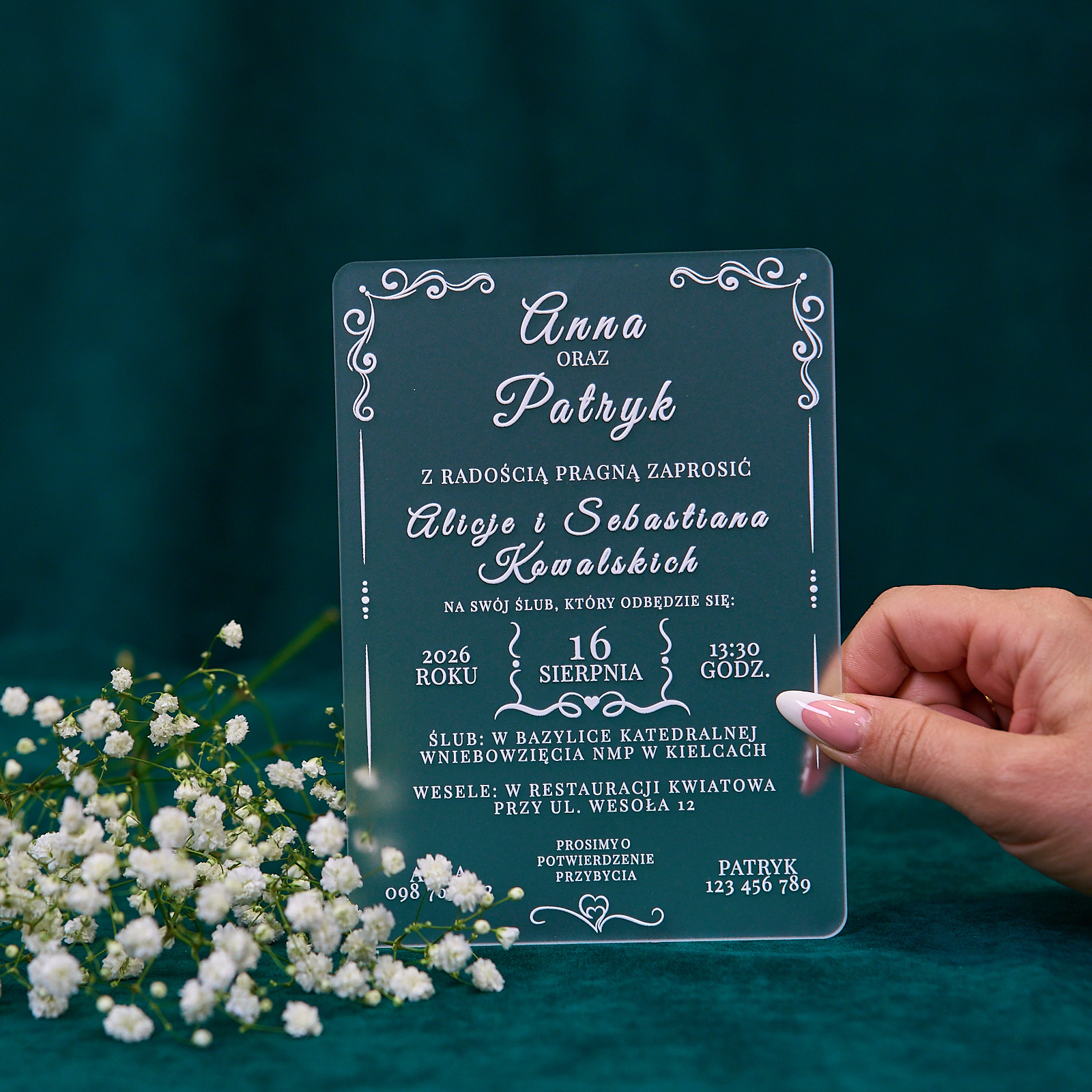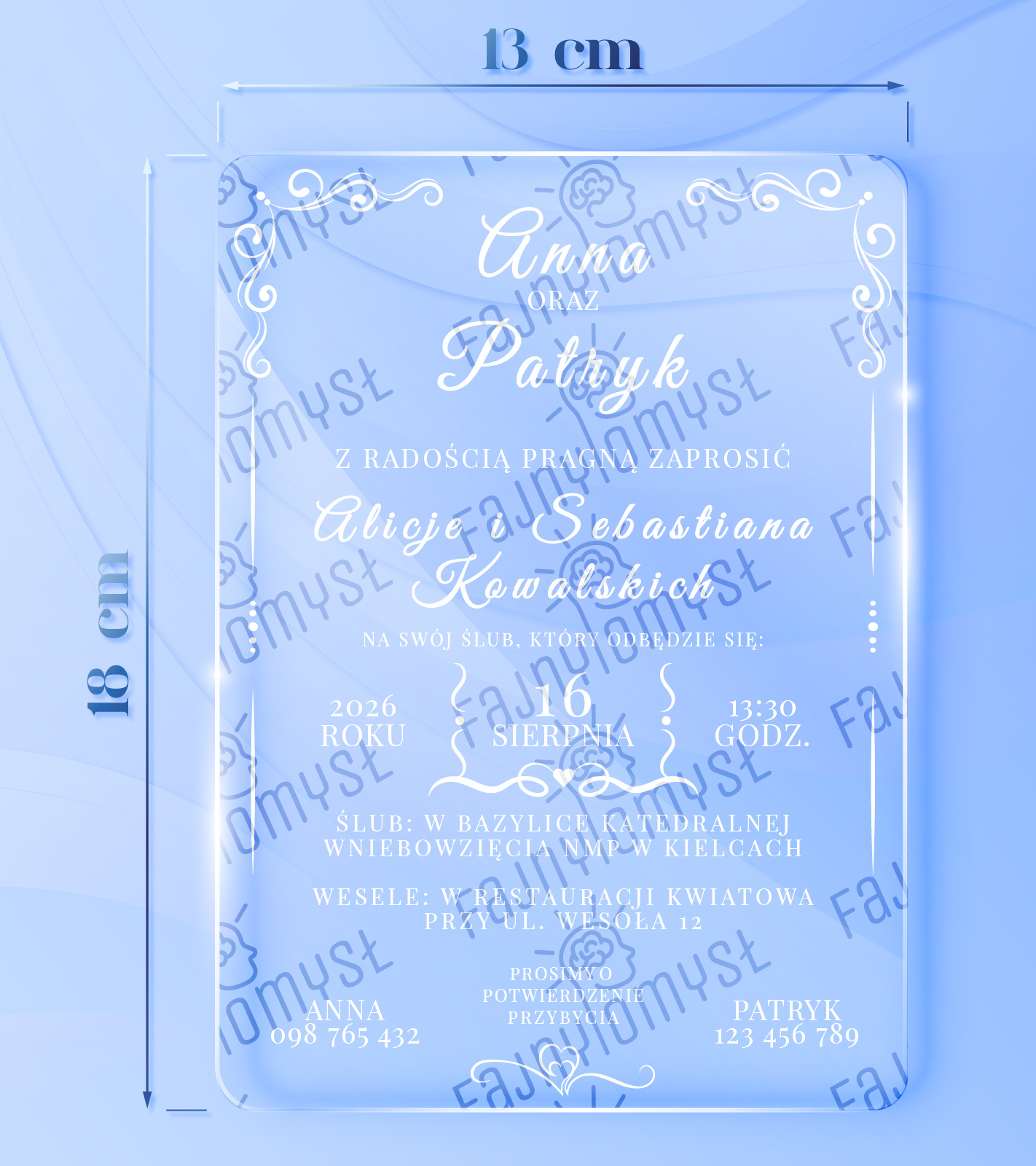 Zaproszenia ślubne PREMIUM wykonane na SZKLE AKRYLOWYM satynowym-ZS01B