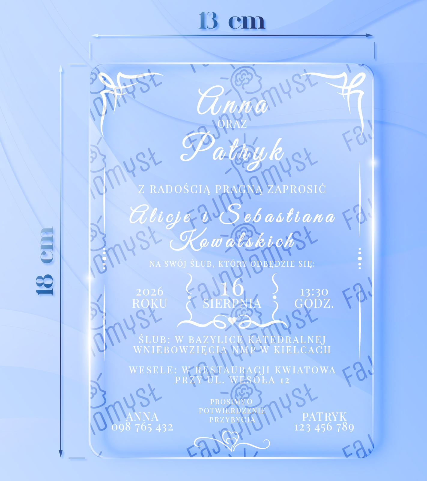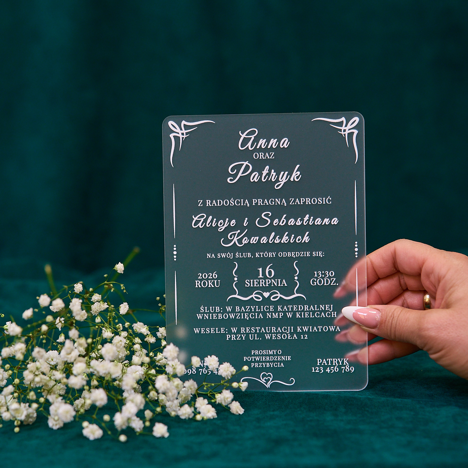 Zaproszenia ślubne PREMIUM wykonane na SZKLE AKRYLOWYM satynowym-ZS01C