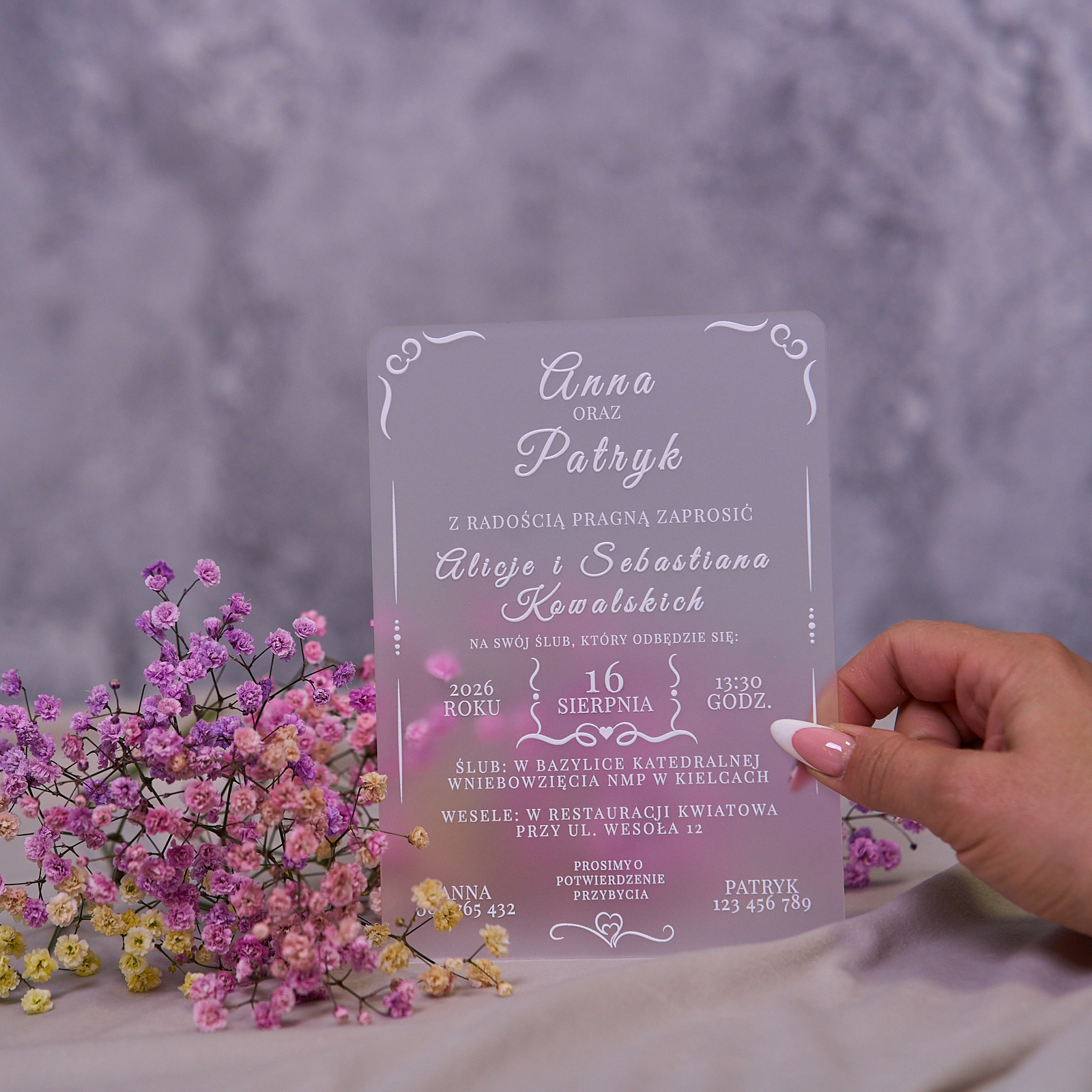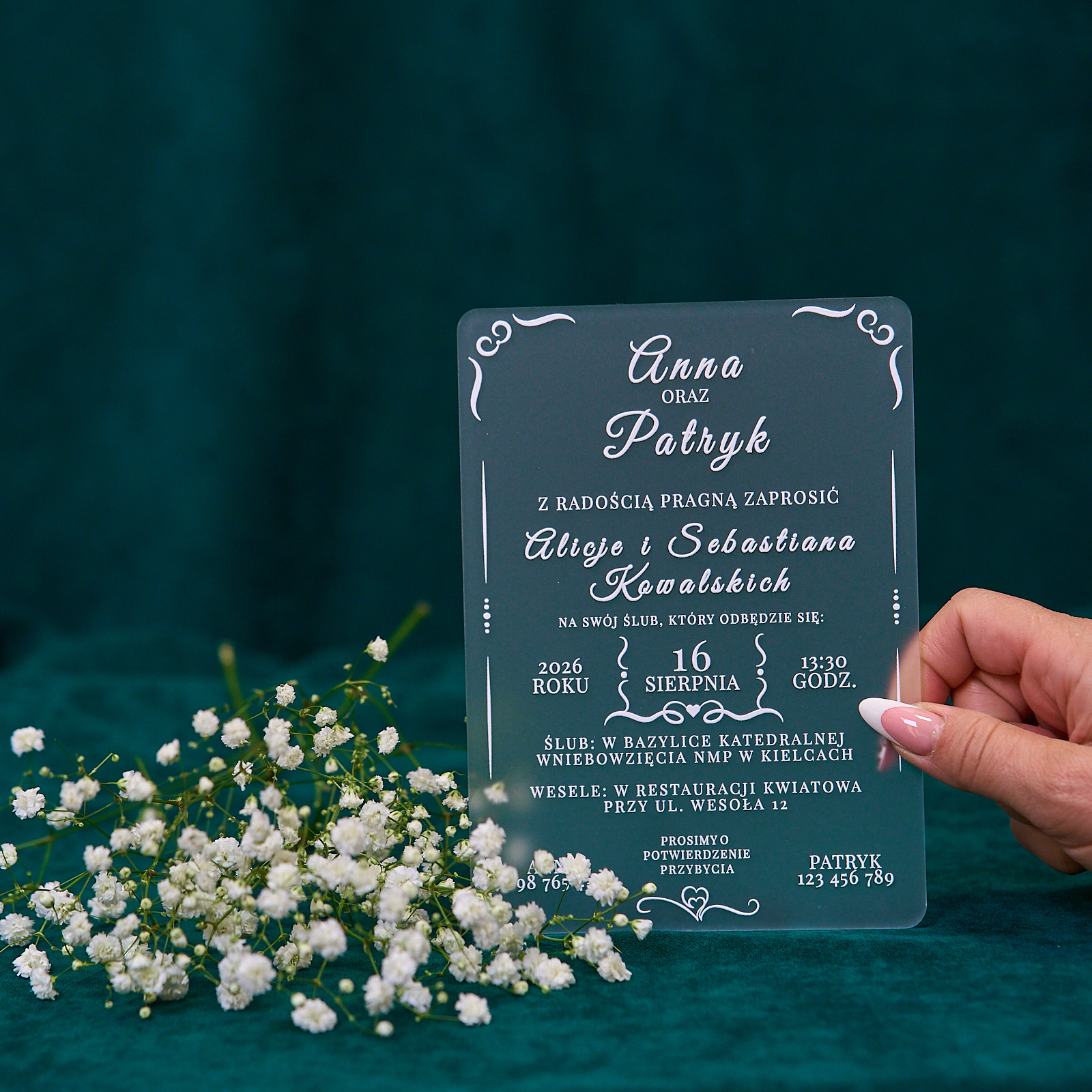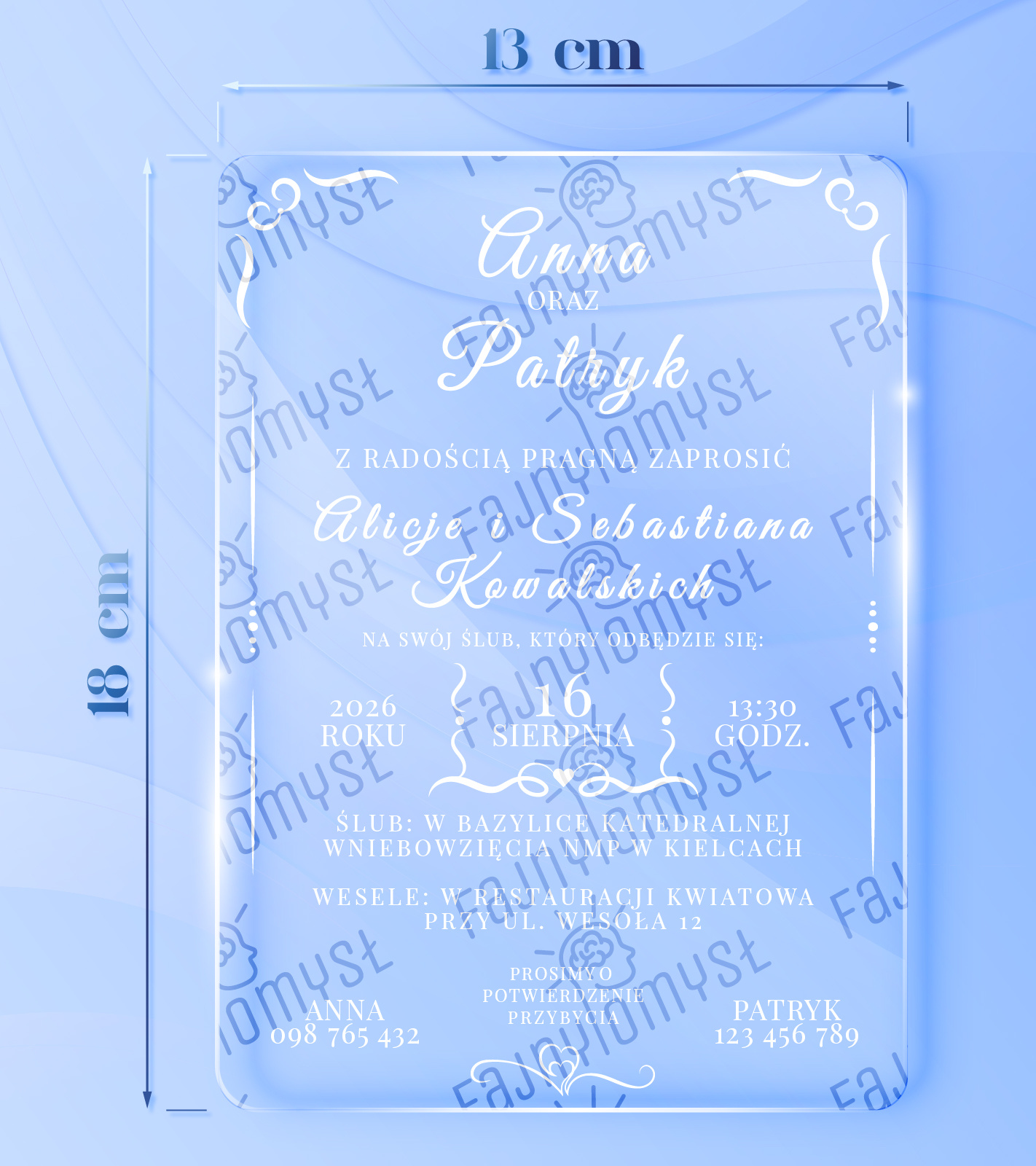 Zaproszenia ślubne PREMIUM wykonane na SZKLE AKRYLOWYM satynowym-ZS01D
